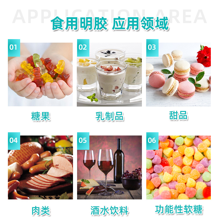 明膠具有獨(dú)特的熱可逆性凝膠能力,可在溫水中溶解,冷卻后成凝膠狀。由于其擁有凝膠、發(fā)泡、乳化和粘合等功能,明膠最常用于糖果、果凍等食品中。